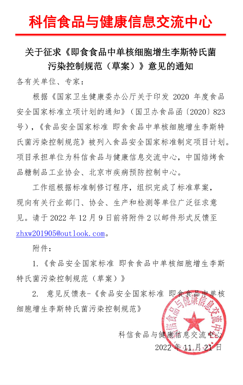关于征求《即食食品中单核细胞增生李斯特氏菌污染控制规范(草案)》意见的通知