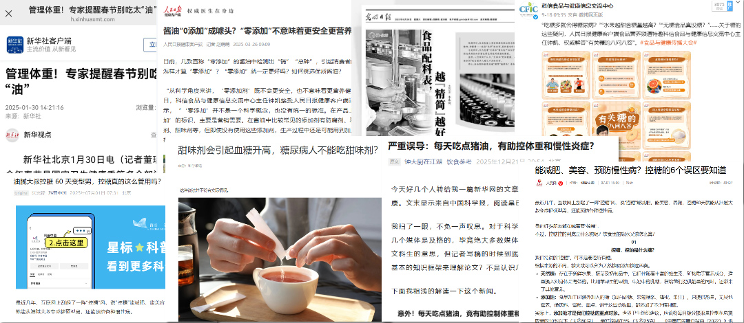 二是结合特定时间节点和社会热点事件,利用多种渠道策划相关话题传播,通过新华社、人民日报健康客户端、光明日报、经济日报、科普中国等数十家中央权威媒体发布,涵盖减油、体重管理误区、糖与甜味剂辟谣等。