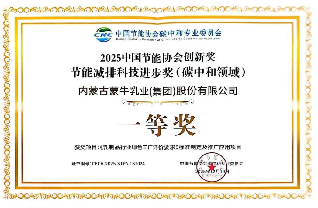 12月19日,第五届“碳中和博鳌大会”暨年度奖项评选颁奖典礼在海南博鳌举行。蒙牛集团凭借参与制定的《乳制品行业绿色工厂评价要求》标准制定及推广应用项目,荣获 2025年中国节能协会创新奖节能减排科技进步奖一等奖(碳中和领域)。